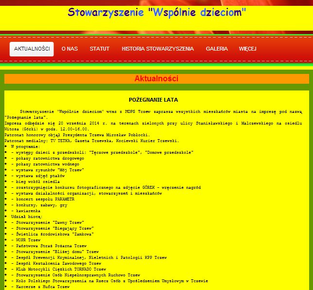 Stowarzyszenie "Wspólnie dzieciom" wraz z MOPS Tczew zaprasza wszystkich mieszkańców miasta na imprezę pod nazwą "Pożegnanie lata" odbywającą się pod patronatem honorowym Prezydenta Tczewa Mirosława Pobłockiego. Impreza odbędzie się 20 września 2014 r. na terenach zielonych przy ulicy Stanisławskiego i Malczewskiego na osiedlu Witosa (Górki) w godz. 12.00-16.00. Oprocz licznych atrakcji w programie znajduje się "Bieg Wokół Osiedla" dla dzieci, młodzieży i dorosłych organizowany przez Stowarzyszenie Biegajacy Tczew. Zapraszamy.